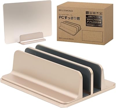 2台のノートPCを収納可能な縦置きノートパソコンスタンドです。上質なアルミ合金素材、幅調整可能、650gの重量と底面の滑り止めでずっしりとした安定感があることが特徴です。パ