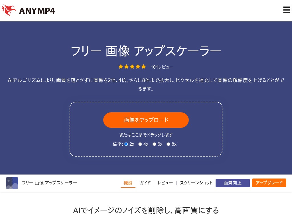 画像をアップロードして1クリックで画像を拡大できます。特別な知識は一切必要ありません。最新のAI技術で、最大16倍まで画像を美しく拡大します。無料枠では1日2回までとなります。