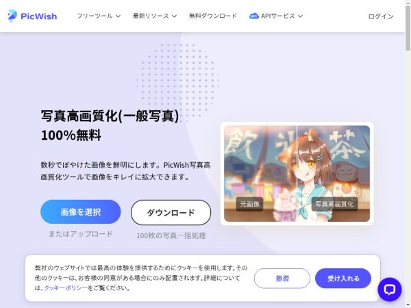 低解像度の荒い写真をAI技術に基づき、写真のぼやけ取り、ピンポケ補正、ピクセル化修正など、全部手軽に修復したり、。人物写真、二次元画像から古い・荒い・低解像度写真まで、全部魔法のように綺麗に生まれ変わり、高画質化し拡大してくれるサービスです。無料の会員登録が必要です。